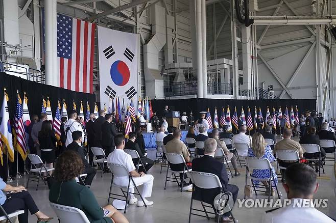 (호놀룰루=연합뉴스) 최재구 기자 = 문재인 대통령이 22일(현지시각) 미국 히캄 공군기지 19번 격납고에서 열린 한미 유해 상호 인수식에서 추모사를 하고 있다. 2021.9.23