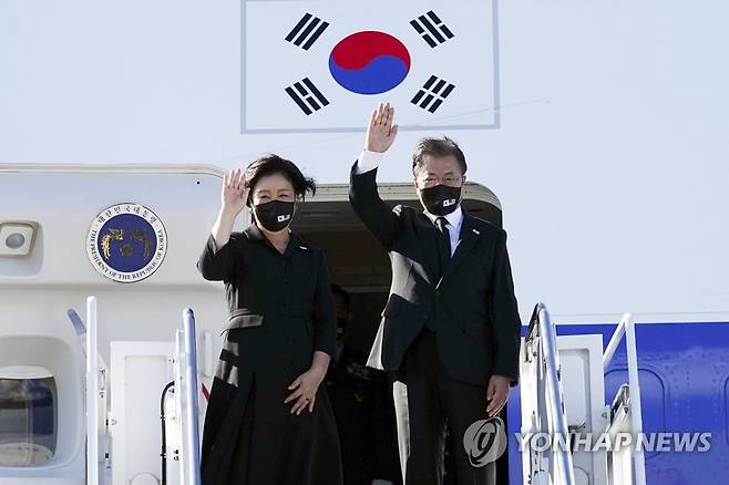(호놀룰루=연합뉴스) 최재구 기자 = 문재인 대통령과 김정숙 여사가 22일(현지시각) 미국 히캄 공군기지에서 뉴욕 및 하와이 방문을 마치고 귀국을 위해 공군 1호기에 올라 손을 들어 인사하고 있다. 2021.9.23