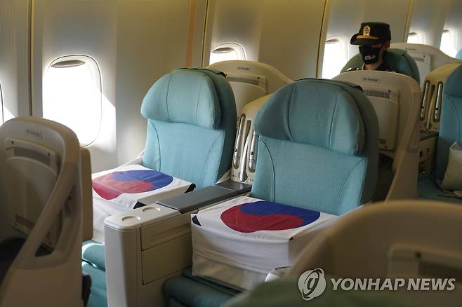 (호놀룰루=연합뉴스) 최재구 기자 = 22일(현지시각) 미국 히캄 공군기지 19번 격납고에서 열린 한미 유해 상호 인수식에서 인수된 유해가 공군1호기 좌석에 안치 되어 있다. 2021.9.23