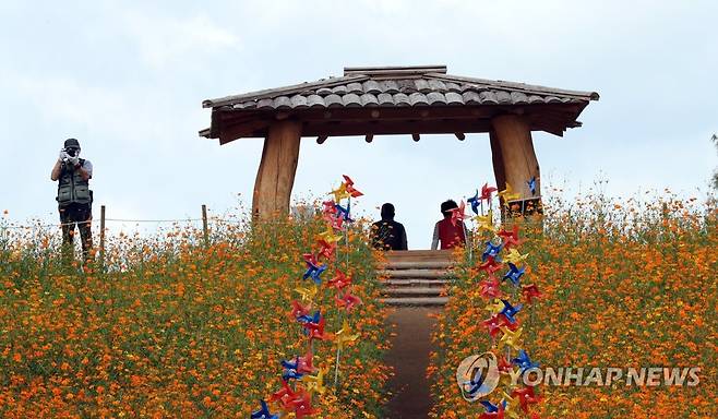 (서울=연합뉴스) 백승렬 기자 = 추분인 23일 서울시 송파구 올림픽공원 들꽃마루에서 시민들이 노랗게 핀 코스모스 풍경을 카메라에 담고 있다. 2021.9.23