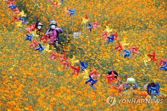 (서울=연합뉴스) 백승렬 기자 = 추분인 23일 서울시 송파구 올림픽공원 들꽃마루에서 시민들이 노랗게 핀 코스모스 길을 거닐며 가을을 만끽하고 있다. 2021.9.23