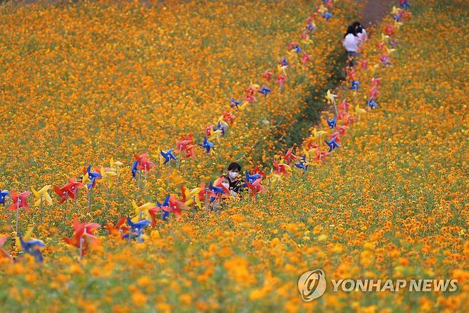 (서울=연합뉴스) 백승렬 기자 = 추분인 23일 서울시 송파구 올림픽공원 들꽃마루에서 시민들이 노랗게 핀 코스모스 길을 거닐며 가을을 만끽하고 있다. 2021.9.23