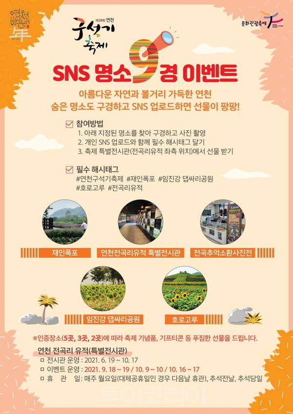 연천군은 '2020-2023 연천 방문의 해'를 맞아 선정한 연천9경과, 2020-2021 문화관광축제로 선정된 '연천 구석기 축제'가 연천! 어디가지 가봤니? SNS 명소 구경 이벤트를 10월 17일까지 진행한다.