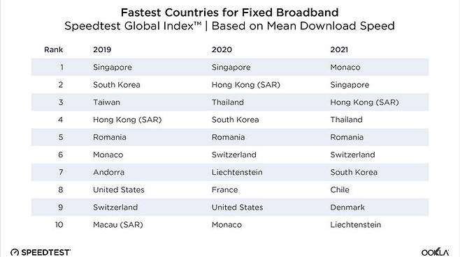 23일 인터넷 속도측정 사이트 '스피드테스트'를 운영하는 우클라(Ookla)에 따르면 올해 우리나라의 초고속인터넷 속도 세계 순위는 7위로 지난해 4위보다 3계단 낮아졌습니다.