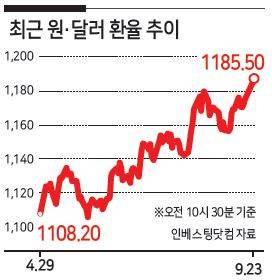 달러당 1185원까지 치솟은 원화가 증시의 단기 변동성을 키우며, 이날 코스피 지수는 3120포인트 선까지 밀리고 있다.