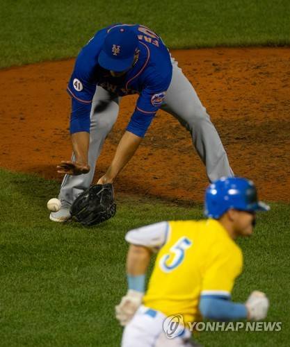 epa09482811 New York Mets relief pitcher Jeurys Familia fields the ball hut by Boston Red Sox's Kike Hernandez (R) during the seventh inning at Fenway Park in Boston, Massachusetts, USA, 22 September 2021. EPA/CJ GUNTHER