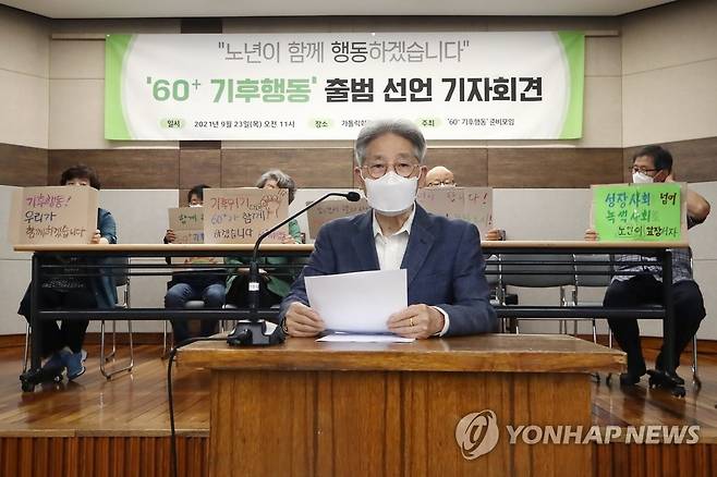 (서울=연합뉴스) 진연수 기자 = 안재웅 한국YMCA전국연맹 재단이사장이 23일 서울 중구 가톨릭회관에서 열린 '60+ 기후행동' 출범 선언 기자회견에서 발언하고 있다. 2021.9.23