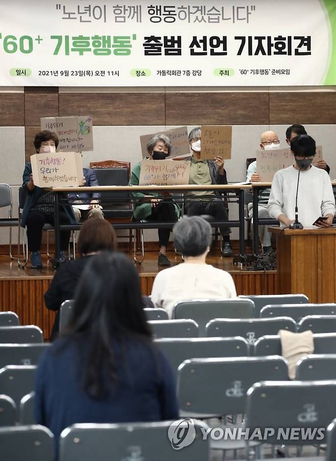 (서울=연합뉴스) 진연수 기자 = 23일 서울 중구 가톨릭회관에서 '60+ 기후행동' 출범 선언 기자회견이 진행되고 있다. 2021.9.23