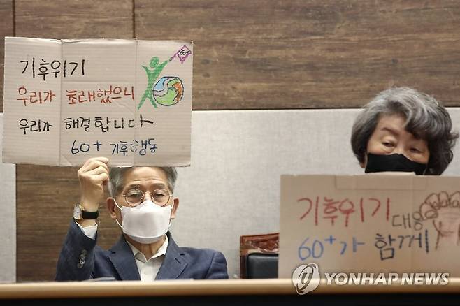 (서울=연합뉴스) 진연수 기자 = 23일 서울 중구 가톨릭회관에서 열린 '60+ 기후행동' 출범 선언 기자회견에서 60+ 기후행동 준비모임 관계자들이 손팻말을 들고 있다. 2021.9.23