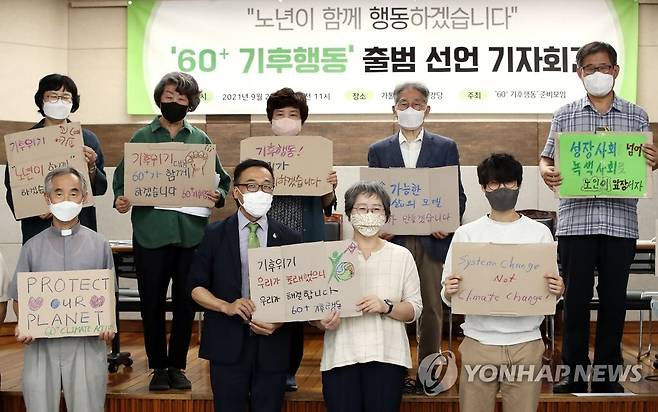 (서울=연합뉴스) 진연수 기자 = 60+ 기후행동 준비모임 관계자들이 23일 서울 중구 가톨릭회관에서 열린 '60+ 기후행동' 출범 선언 기자회견에서 손팻말을 들고 있다. 2021.9.23