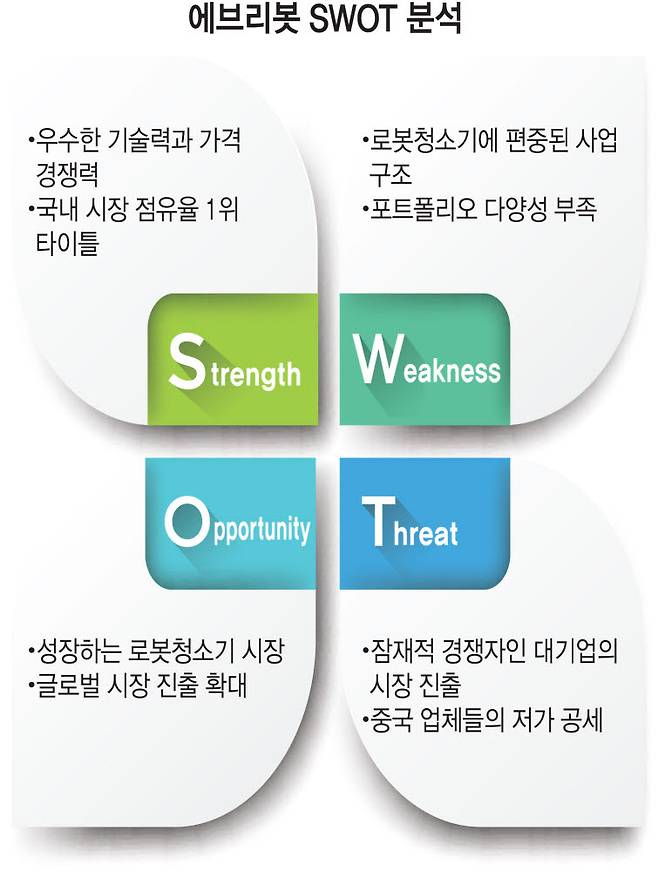에브리봇이 로봇청소기 한 제품으로 성장세를 지속하고 있지만, 제품 포트폴리오가 다양하지 않은 것은 약점이다. 에브리봇이 독자 개발한 물걸레 청소기는 인기 제품인 엣지에 이어 쓰리스핀을 선보이며 경쟁력을 이어가고 있다. 그러나 흡입형은 자체 개발이 아니라 중국 기업에서 도입해 판매하고 있다. 향후 IoT, AI 등을 접목한 신제품으로 포트폴리오를 확장하고, 다양한 소비자 층을 공략하는 것이 관건이다.