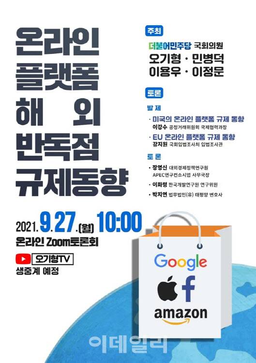 국회 정무위원회 소속 더불어민주당 오기형 의원은 같은당 민병덕 의원, 이용우 의원, 이정문 의원과 공동으로 27일 ‘온라인 플랫폼 해외 반독점 규제동향’을 주제로 토론회를 개최한다고 23일 밝혔다.