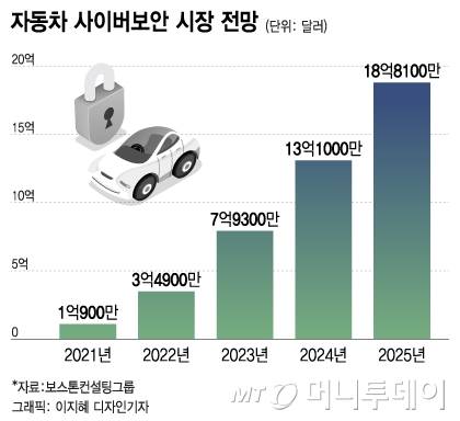 보스톤컨설팅그룹에 따르면 자동차 사이버보안 시장 규모는 올해 1억900만달러에서 2025년 18억8100만달러(2조2200억원)로 늘어날 전망이다.