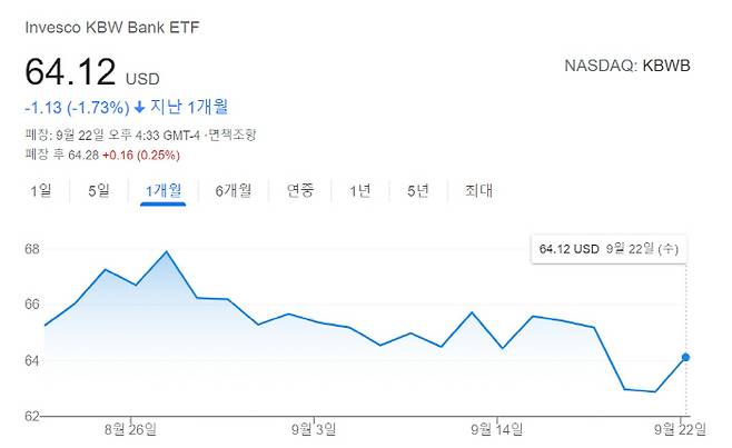 해당 ETF는 웰스파고를 비롯해 U.S.뱅코프, JP모건, 뱅크오브아메리카, 시티 그룹, SVB파이낸셜 등 미국 대형 금융주 주가를 추종한다.