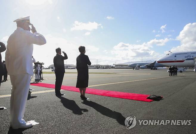 (호놀룰루=연합뉴스) 최재구 기자 = 문재인 대통령이 22일(현지시각) 미국 히캄 공군기지 19번 격납고에서 열린 한미 유해 상호 인수식에서 공군1호기로 봉송되는 유해를 향해 경례하고 있다. 2021.9.23