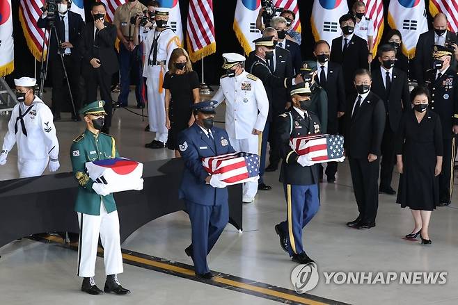 (호놀룰루=연합뉴스) 최재구 기자 = 문재인 대통령과 김정숙 여사가 참석한 가운데 22일(현지시각) 미국 히캄 공군기지 19번 격납고에서 열린 한미 유해 상호 인수식에서 의장병이 유해를 항공기로 봉송하고 있다. 2021.9.23