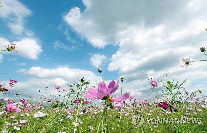 (청주=연합뉴스) 천경환 기자 = 절기상 추분인 23일 오후 충북 진천군 덕산읍에 코스모스가 활짝 피어있다. 2021.9.23