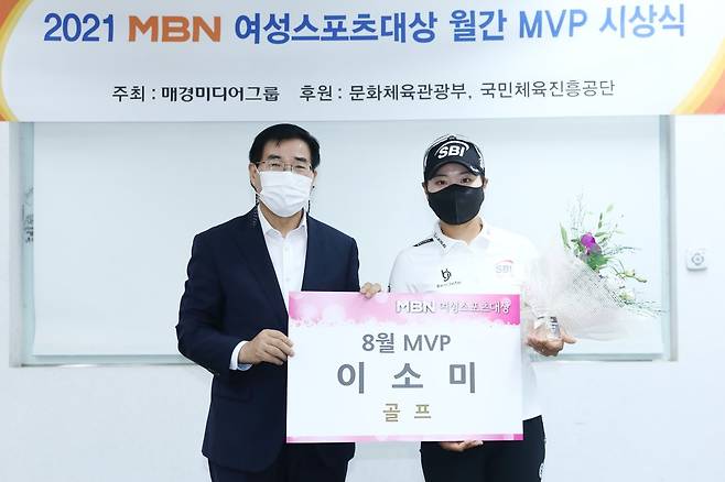 (서울=연합뉴스) 한국여자프로골프(KLPGA) 투어에서 활약하는 이소미(오른쪽)가 23일 서울 중구 퇴계로 매경미디어센터에서 열린 '2021 MBN 여성스포츠대상 시상식'에서 류호길 MBN 대표이사로부터 8월 최우수선수(MVP) 상패를 받은 뒤 기념 촬영을 하고 있다. 2021.9.23