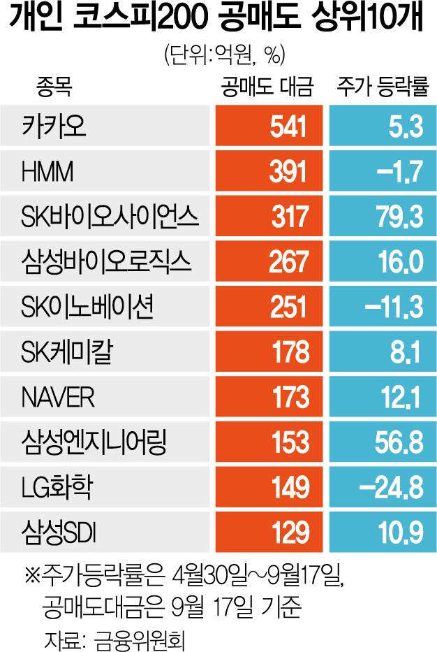 개인 공매도 거래 대금 상위 종목은 카카오·HMM·SK바이오사이언스·삼성바이오로직스·SK이노베이션 등이 차지했다. 시장 전체 순위는 카카오·삼성전자·HMM·SK하이닉스·LG화학 순이었다.