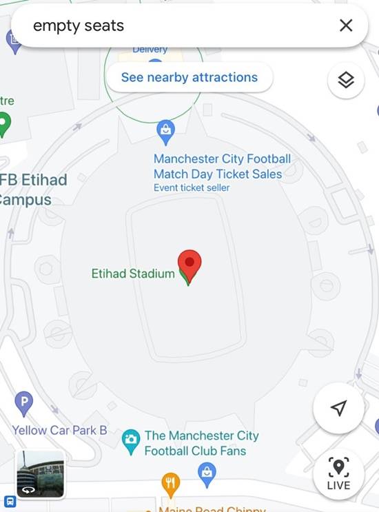 이어 "경쟁팀 팬들은 과르디올라의 발언 이후 구글 지도를 해킹해 빈 좌석(Empty Seats)을 검색하면 맨체스터 시티의 홈경기장인 에티하드 스타디움이 연결되도록 했다"라고 전했다.