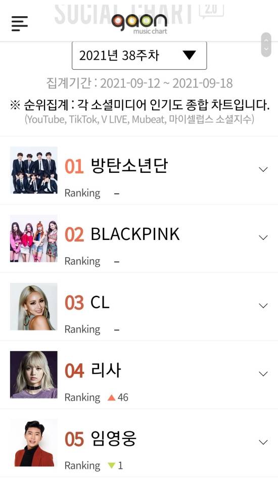 가온차트에 따르면 임영웅은 2021년 38주 차 가온 소셜차트 TOP4에 올랐다.