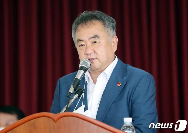 (제주=뉴스1) 오현지 기자 = 송재호 더불어민주당 의원이 23일 오전 제주시 건입동 제주항운노조 회의실에서 열린 간담회에서 인사말을 하고 있다. 2021.9.23/뉴스1