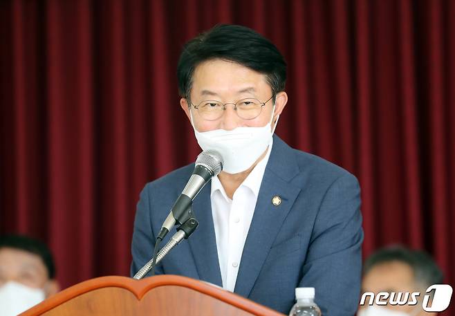 (제주=뉴스1) 오현지 기자 = 이재명 열린캠프 총괄본부장인 조정식 더불어민주당 의원이 23일 오전 제주시 건입동 제주항운노조 회의실에서 열린 간담회에서 인사말을 하고 있다. 2021.9.23/뉴스1