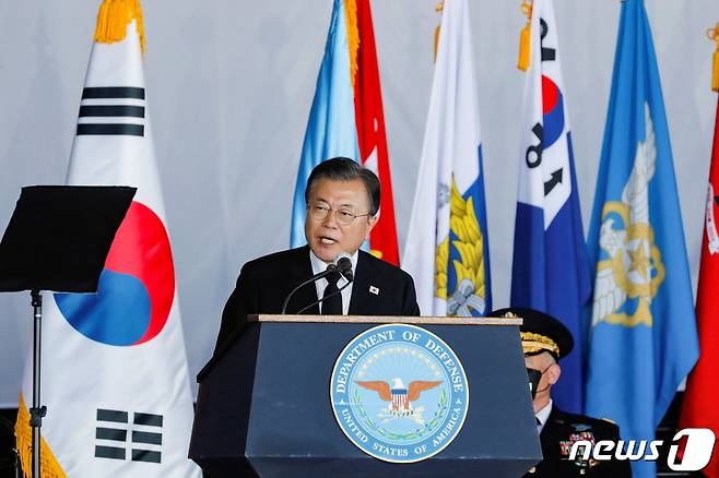 (로이터=뉴스1) = 문재인 대통령이 22일(현지시간) 미국 하와이 호놀룰루 히캄 공군기지에서 열린 한미 유해 상호 인수식에서 추모사를 하고 있다.©로이터=뉴스1
