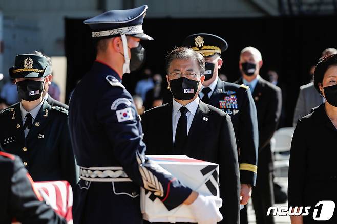 (로이터=뉴스1) = 문재인 대통령이 22일(현지시간) 미국 하와이 호놀룰루 히캄 공군기지에서 열린 한미 유해 상호 인수식에 참석, 의장병이 유해를 항공기로 봉송하고 있다.©로이터=뉴스1