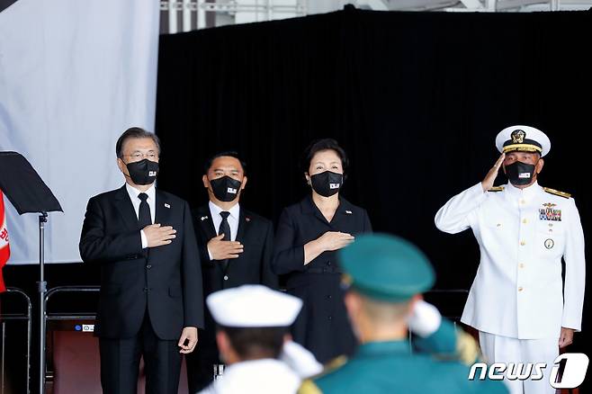 (로이터=뉴스1) = 문재인 대통령과 김정숙 여사가 22일(현지시간) 미국 하와이 호놀룰루 히캄 공군기지에서 열린 한미 유해 상호 인수식에서 국민의례를 하고 있다.©로이터=뉴스1