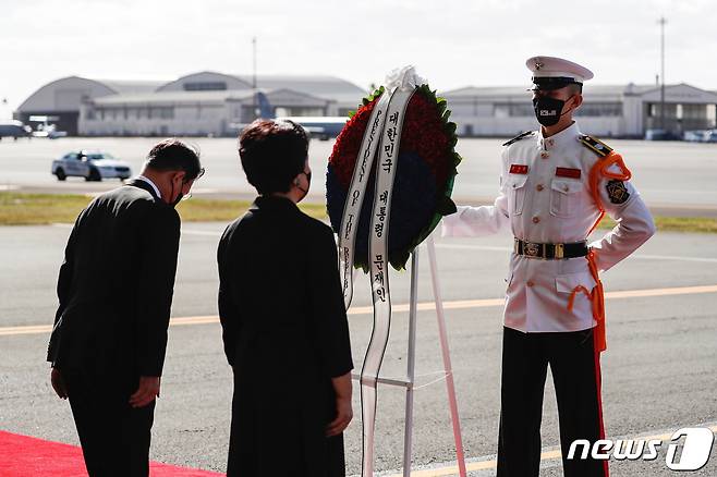(로이터=뉴스1) = 문재인 대통령과 김정숙 여사가 22일(현지시간) 미국 하와이 호놀룰루 히캄 공군기지에서 열린 한미 유해 상호 인수식에 참석해 헌화하고 있다.© 로이터=뉴스1