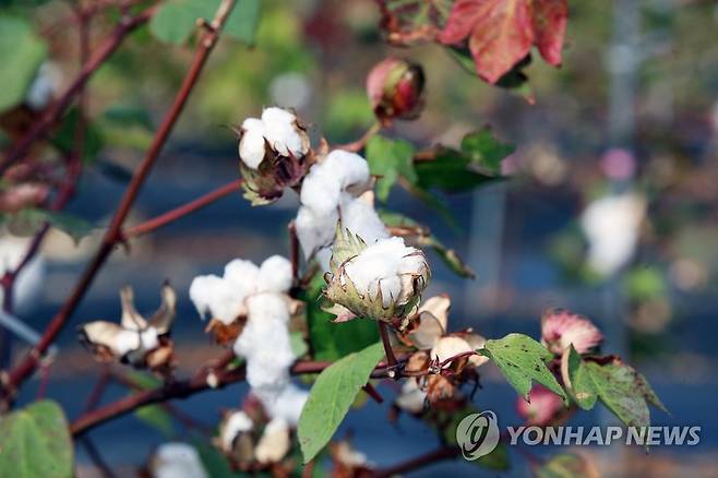 (목포=연합뉴스) 천정인 기자 = 절기상 추분(秋分)인 23일 오후 전남 목포시 달동 고하도 목화 체험장에 목화솜이 피어있다. 추분은 낮과 밤의 길이가 같은 날로 추분을 전후로 곡식을 수확하고 목화를 딴다. 2021.9.23