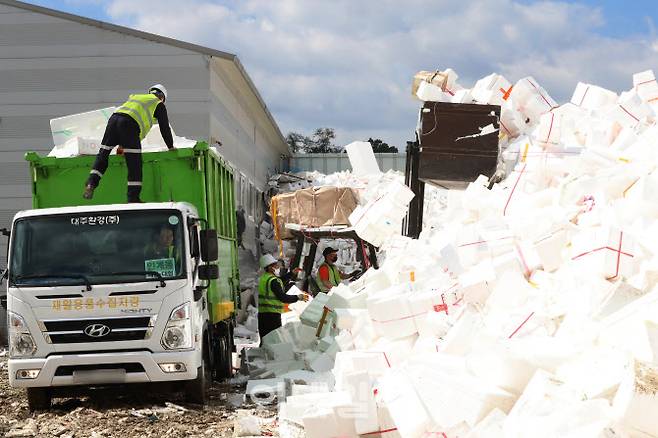 [이데일리 이영훈 기자] 추석 연휴가 끝난 23일 오전 경기도 수원시 영통구 수원시자원순환센터에 스티로폼이 쌓여있다.