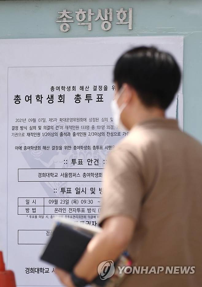 (서울=연합뉴스) 이재희 기자 = 23일 오후 서울 동대문구 경희대 내 알림판에 총여학생회 해산 결정을 위한 총투표 시행 공고문이 붙어 있다.