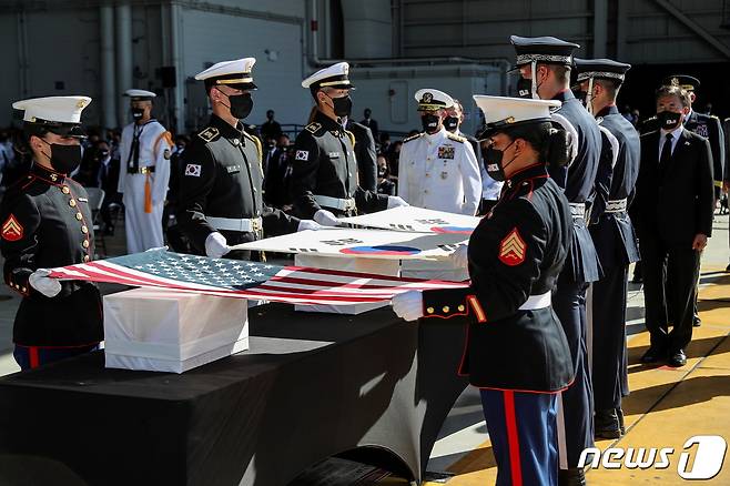 (로이터=뉴스1) = 문재인 대통령이 22일(현지시간) 미국 하와이 호놀룰루 히캄 공군기지에서 열린 한미 유해 상호 인수식에서 유해 관포 교체를 지켜보고 있다.© 로이터=뉴스1