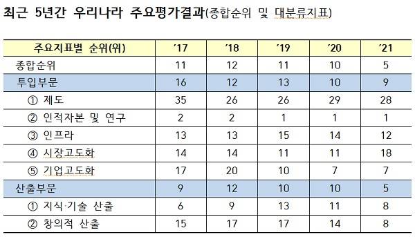 우리나라는 제도, 인적자본·연구, 인프라, 시장 고도화 등 투입부문 5개, 지식·기술 산출, 창의적 산출 등 산출부문 2개 등 모두 7개의 평가분야 가운데 미래에 대한 투자를 평가하는 인적자본·연구 분야에서 3년 연속 세계 1위를 지켰다.