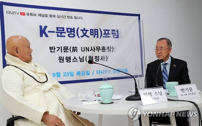 (서울=연합뉴스) 백승렬 기자 = 원행 조계종 대종사 스님(왼쪽, 월정사)과 반기문 전 유엔사무총장이 23일 서울시 종로구 다나미디어에서 유튜브로 생중계된 제3차 K문명포럼에서 기후위기 상황과 탄소중립 문제 등에 관해 대담하고 있다. 원행 대종사는 다가오는 인류에 대한 미래비전 제시를 위해 한국 종교지도자와 각계 지도층과의 대담을 여는 K문명 포럼을 열었다. 2021.9.23