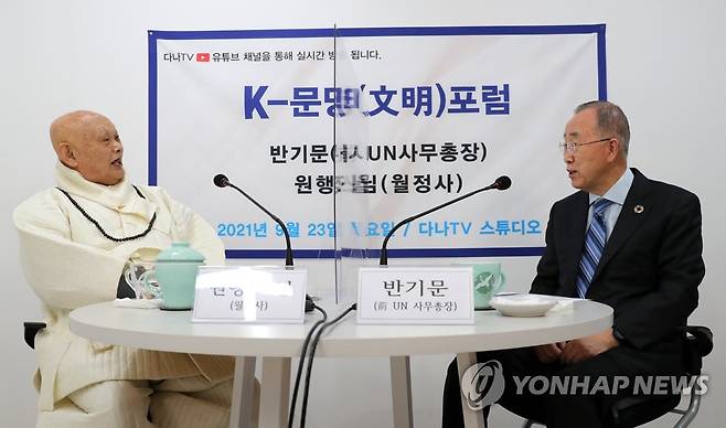 (서울=연합뉴스) 백승렬 기자 = 원행 조계종 대종사 스님(왼쪽, 월정사)과 반기문 전 유엔사무총장이 23일 서울시 종로구 다나미디어에서 유튜브로 생중계된 제3차 K문명포럼에서 기후위기 상황과 탄소중립 문제 등에 관해 대담하고 있다. 원행 대종사는 다가오는 인류에 대한 미래비전 제시를 위해 한국 종교지도자와 각계 지도층과의 대담을 여는 K문명 포럼을 열었다. 2021.9.23