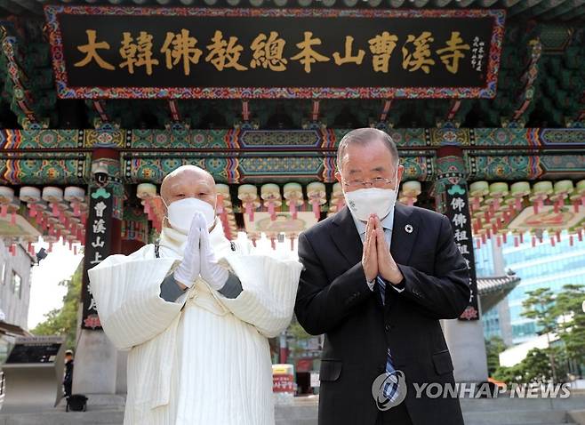 (서울=연합뉴스) 백승렬 기자 = 반기문 전 유엔사무총장과 원행 조계종 대종사 스님(왼쪽, 월정사)이 23일 서울시 종로구 다나미디어에서 유튜브로 생중계된 제3차 K문명포럼에서 기후위기 상황과 탄소중립 문제 등에 관해 대담하기 전 조계사 일주문 앞에서 기념 촬영을 하고 있다. 원행 대종사는 다가오는 인류에 대한 미래비전 제시를 위해 한국 종교지도자와 각계 지도층과의 대담을 여는 K문명 포럼을 열었다. 2021.9.23
