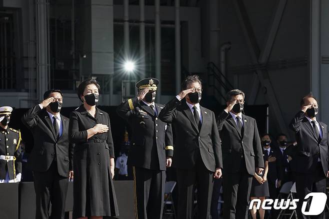 (서울=뉴스1) = 문재인 대통령이 22일(현지시간) 미국 하와이 호놀룰루 히캄 공군기지에서 열린 한미 유해 상호 인수식에서 공군1호기로 봉송되는 유해를 향해 경례하고 있다.(청와대 제공)2021.9.23/뉴스1
