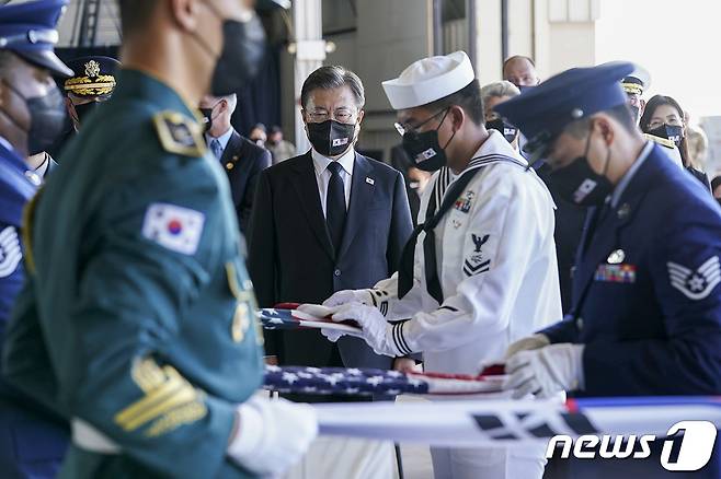 (서울=뉴스1) = 문재인 대통령이 22일(현지시간) 미국 하와이 호놀룰루 히캄 공군기지에서 열린 한미 유해 상호 인수식에서 유해 관포 교체를 지켜보고 있다.(청와대 제공)2021.9.23/뉴스1