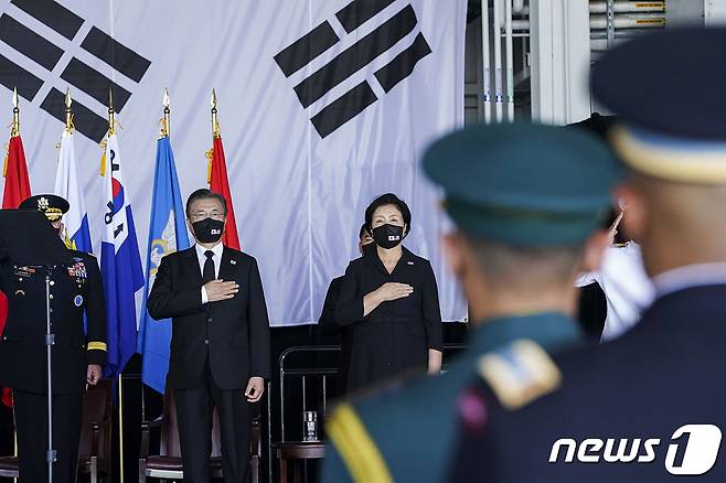 (서울=뉴스1) = 문재인 대통령과 김정숙 여사가 22일(현지시간) 미국 하와이 호놀룰루 히캄 공군기지에서 열린 한미 유해 상호 인수식에서 국민의례를 하고 있다.(청와대 제공)2021.9.23/뉴스1