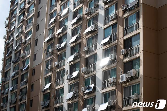 (서울=뉴스1) 유승관 기자 = 23일 서울시내 한 아파트단지 내 각 세대 베란다에 태양광 패널이 설치돼 있다.