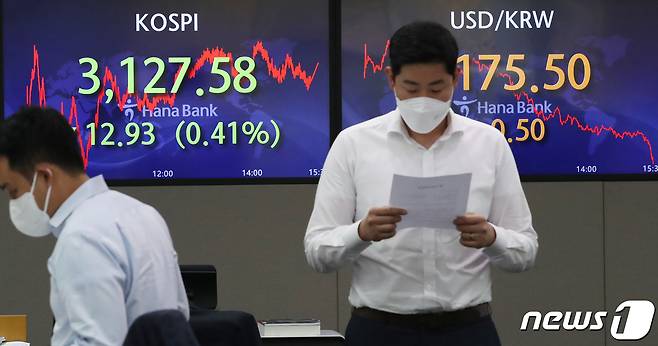 (서울=뉴스1) 송원영 기자 = 23일 오후 서울 중구 하나은행 딜링룸 전광판에 코스피 지수가 전 거래일보다 12.93 포인트(0.41%) 하락한 3127.58을 나타내고 있다. 이날 코스닥지수는 전일 대비 9.85포인트(0.94%) 내린 1036.27로 마감했다. 원달러 환율은 전날보다 0.5원 오른 1175.5원에 거래를 마감했다. 2021.9.23/뉴스1