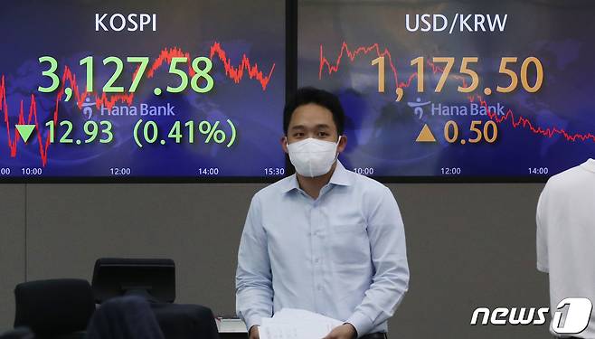 (서울=뉴스1) 송원영 기자 = 23일 오후 서울 중구 하나은행 딜링룸 전광판에 코스피 지수가 전 거래일보다 12.93 포인트(0.41%) 하락한 3127.58을 나타내고 있다. 이날 코스닥지수는 전일 대비 9.85포인트(0.94%) 내린 1036.27로 마감했다. 원달러 환율은 전날보다 0.5원 오른 1175.5원에 거래를 마감했다. 2021.9.23/뉴스1