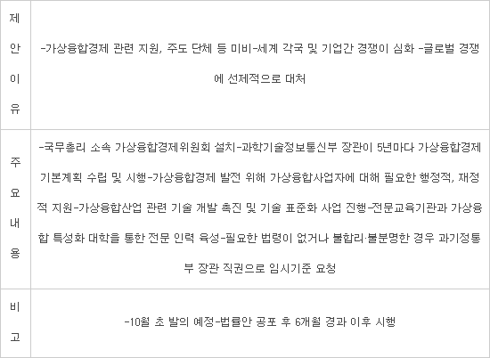 가상융합경제 발전 및 지원에 관한 법률안 개요