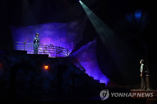 (서울=연합뉴스) 강민지 기자 = 23일 오후 서울 종로구 예스24스테이지에서 열린 뮤지컬 '미인'프레스콜에서 배우들이 하이라이트 장면을 시연하고 있다. 2021.9.23