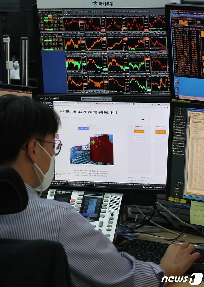 (서울=뉴스1) 송원영 기자 = 23일 오후 서울 중구 하나은행 딜링룸에서 딜러가 중국 부동산 개발회사 헝다그룹 리스크 관련 뉴스를 모니터에 띄워놓고 있다. 이날 코스피 지수는 전 거래일 대비 12.93포인트(0.41%) 내린 3127.58에 거래를 마쳤다. 2021.9.23/뉴스1