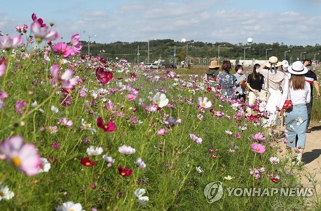 (영종도=연합뉴스) 임헌정 기자 = 낮과 밤의 길이가 같아지는 절기상 추분(秋分)인 23일 영종도 인천국제공항 하늘정원을 찾은 시민들이 코스모스를 감상하고 있다. 2021.9.23
