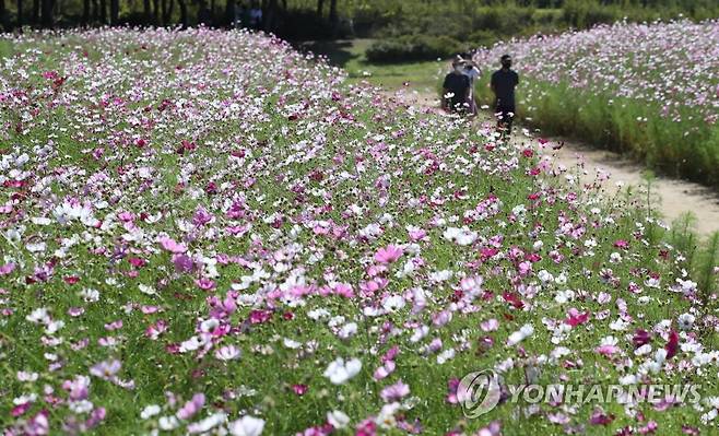 (영종도=연합뉴스) 임헌정 기자 = 낮과 밤의 길이가 같아지는 절기상 추분(秋分)인 23일 영종도 인천국제공항 하늘정원을 찾은 시민들이 코스모스를 감상하고 있다. 2021.9.23